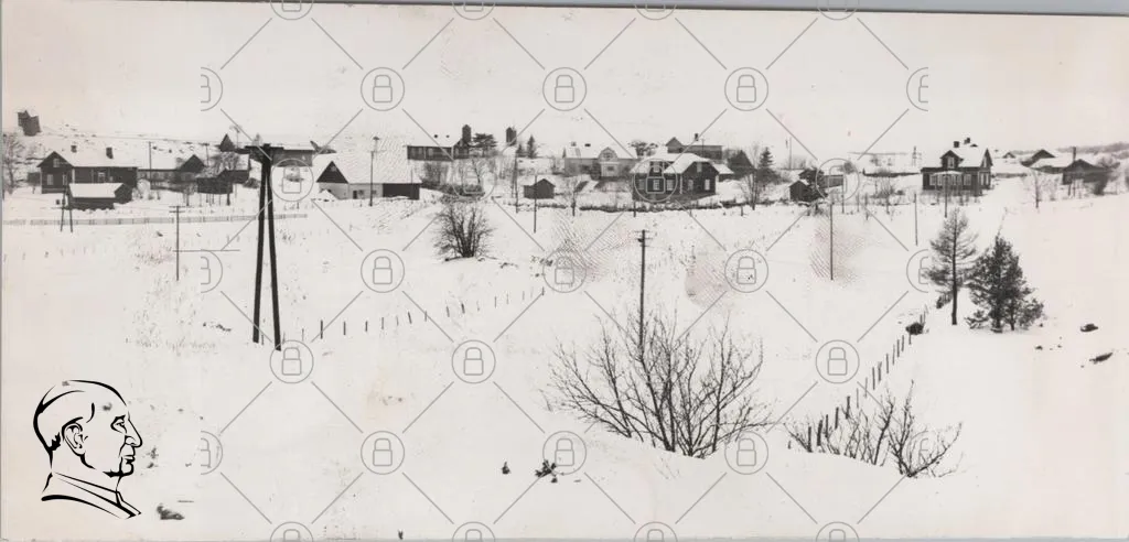 vinter, snö, landskap, hus, träd, staket, elstolpe, by, landsbygd, svartvitt, gammal bild, snötäckt, buskar, himmel, byggnader