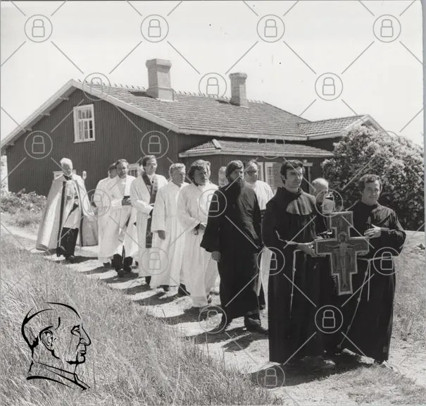 präst, kloster, kors, procession, vit klädsel, svart klädsel, hus, landskap, väg, grupp, tradition, religiös, ceremon, historia, kultur, natur, sommar, gammal, svartvitt, andakt