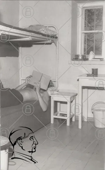 man, läsande, bok, säng, rum, inomhus, möbler, bord, stol, fönster, svartvitt, avslappnad, ensam, interiör, vardagsliv, 1900-tal, minimalistisk, hem, litteratur, fritid