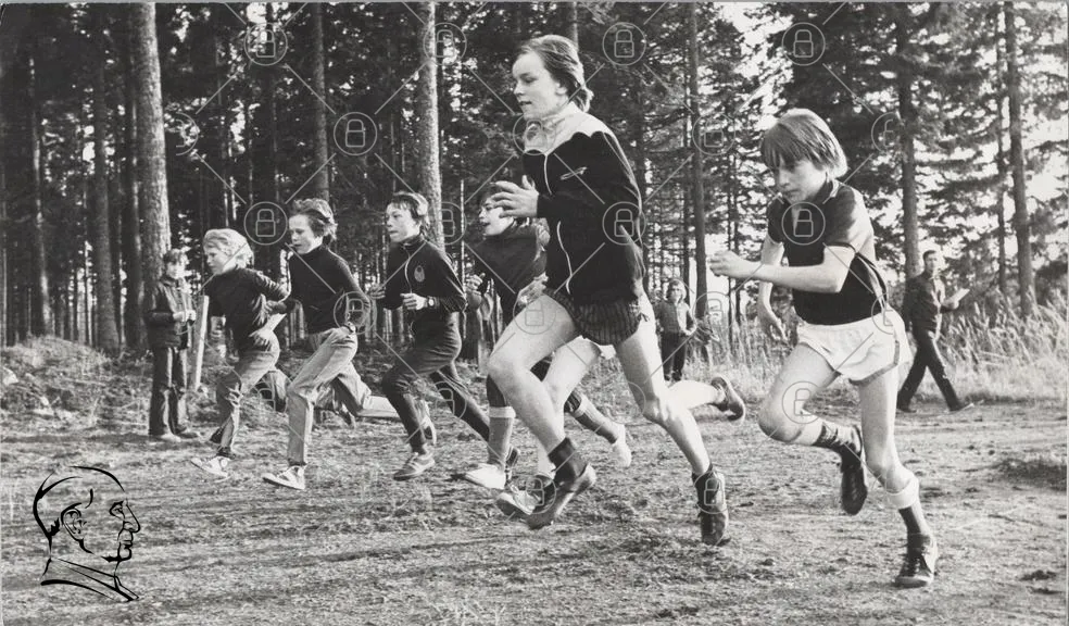 barn, löpning, skog, träning, sport, svartvitt, ungdomar, tävling, motion, natur, 1970-tal, shorts, tröjor, skor, grupp, aktivitet, utomhus, hastighet, energi, glädje, kamratskap