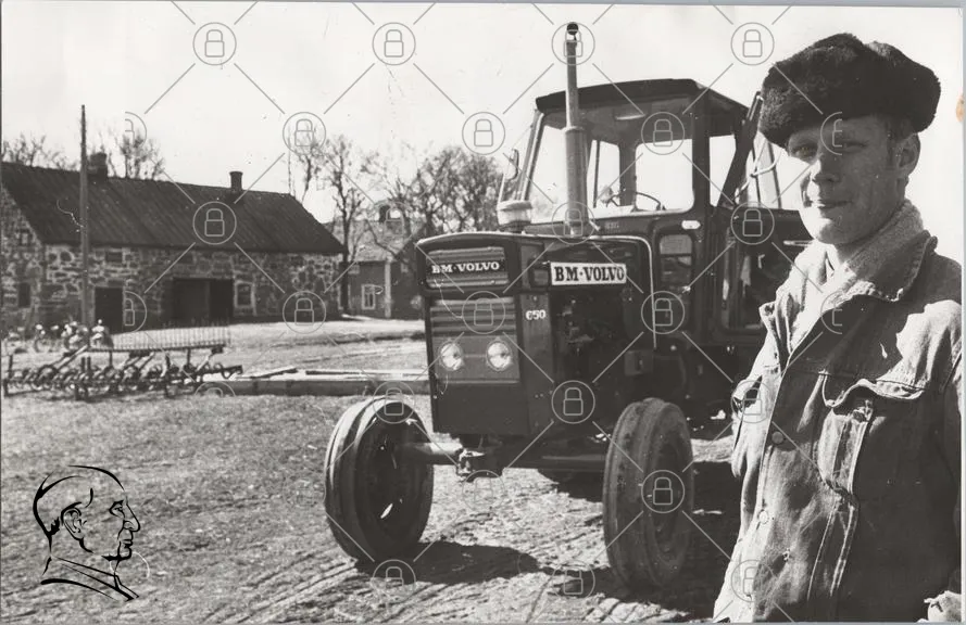 traktor, BM Volvo, landskap, jordbruk, maskin, vintage, grön, fält, gård, landsbygden, fordon, skog, fönster, hjul, metall, gammal, svensk, motor, mekanik, utomhus, natur, byggnad, man, arbete, traditionell, jordbruksmaskin, historia, teknik, landsbygdsliv, skandinavisk