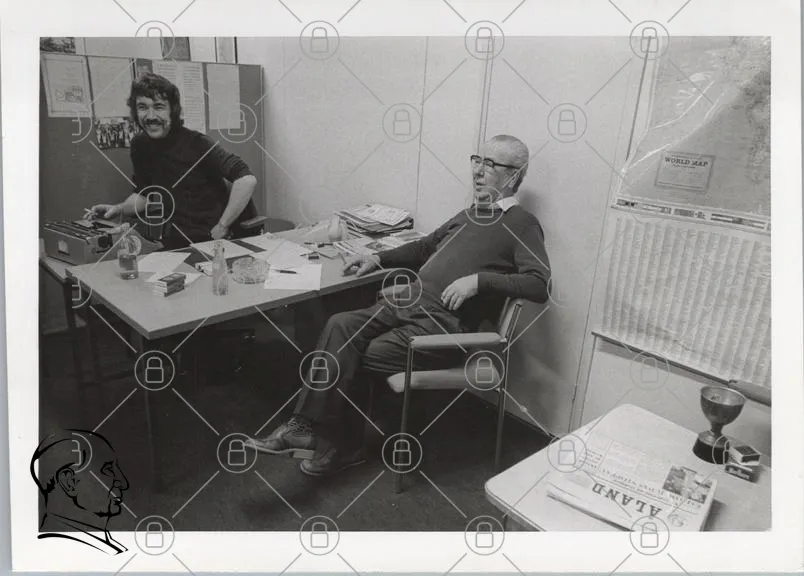 två personer, skrivbord, kontor, papper, tidningar, glas, leende, man, äldre, yngre, stolar, inomhus, svartvitt, dokument, arbetsmiljö, samtal, kreativitet, samarbete, arbetsplats, avslappnad, diskussion