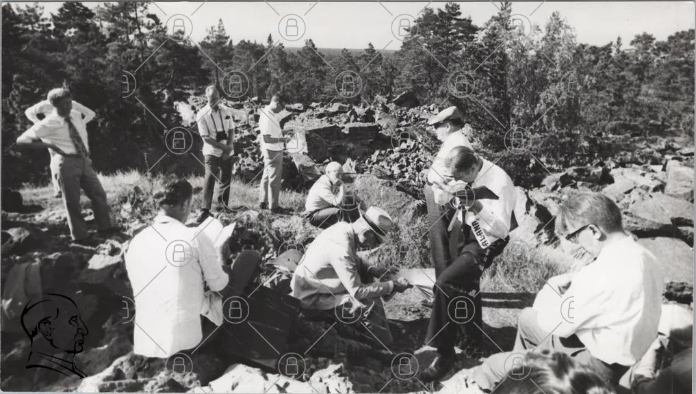 natur, människor, forskning, sten, skog, anteckningar, kläder, hattar, grupp, utomhus, landskap, observation, geologi, aktivitet, 1900-tal, svartvit, samling, studier, miljö, vetenskap