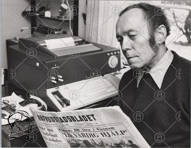 man, tidning, skrivmaskin, kontor, svartvitt, retro, journalist, nyheter, 1970-tal, papper, skrivbord, Hufvudstadsbladet, text, kläder, ansiktsuttryck, teknik, arbete, historia, kultur, fotografi