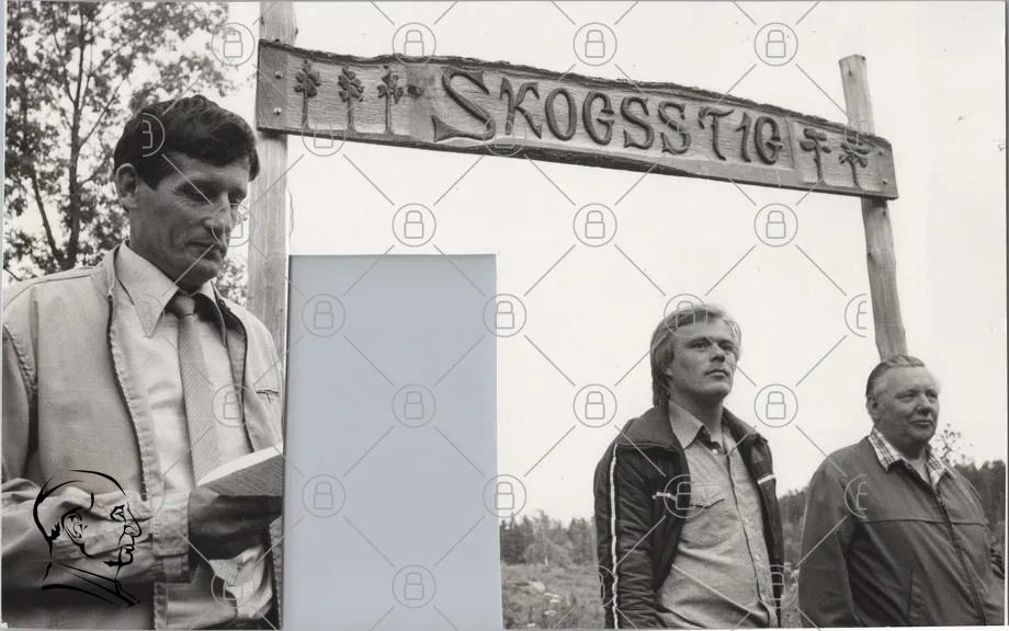 skogsstig, skylt, män, natur, svartvitt, trä, bok, landskap, vandring, 1970-tal, kläder, fotografering, utomhus, träd, berg, vägskylt, svensk, kultur, historia, fritid, rekreation