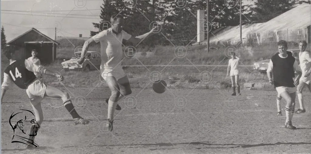 fotboll, spelare, boll, gräs, sport, träning, lag, utomhus, 1960-tal, svartvitt, motion, tävling, ungdomar, fotbollsplan, aktivitet, sommar, skor, shorts, tröja, passning, mål, kamratanda, gemenskap, lek, glädje, natur, landskap, fotbollsmatch, tradition