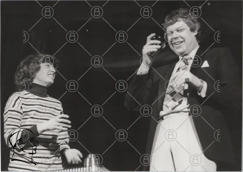 svartvitt, kvinna, man, skratt, kläder, stripad tröja, kostym, scen, underhållning, 1970-tal, publik, gestikulera, leende, mikrofon, show, komedi, artist, framträdande, ljus, bakgrund, interaktion, uttryck, vintage, nostalgi, teater, presentation, humor, socialt, samspel, minnen