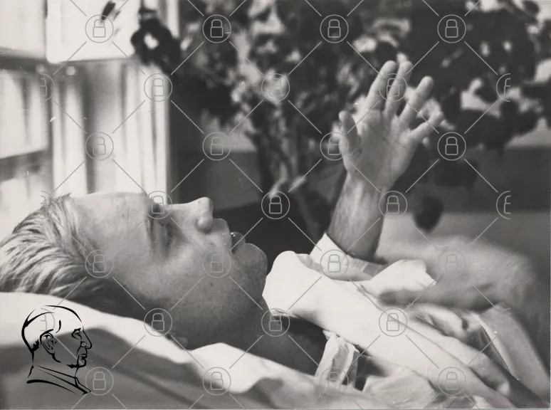 man, säng, hand, gestikulera, svartvitt, inomhus, uttryck, ansikte, kläder, avslappnad, rum, växt, fokus, kommunikation, kroppsspråk, känslor, interaktion, stilla, 1970-tal, vintage