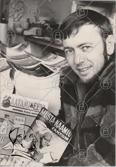 man, svartvitt, tidningar, serietidningar, Aatami, Eevy, Musta, Naami, Fantom, illustration, konst, retro, 1970-tal, leende, kläder, mönster, inomhus, kontor, tryck, grafik, humor, tecknad, bild, kultur, nostalgi, kreativitet