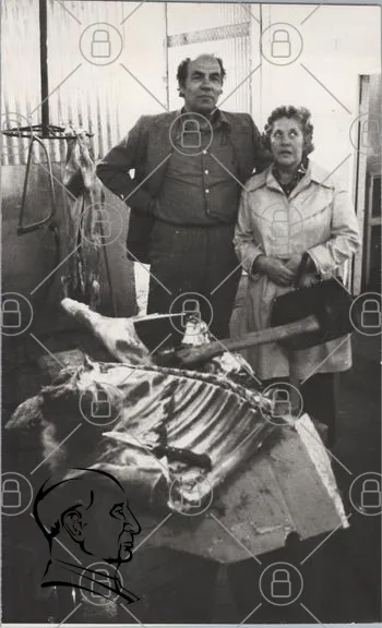 man, kvinna, kött, slakt, verktyg, kniv, yxa, gammal, svartvitt, traditionell, bondgård, djur, arbete, landsbygd, historia, hantverk, mat, familj, samarbete, kultur