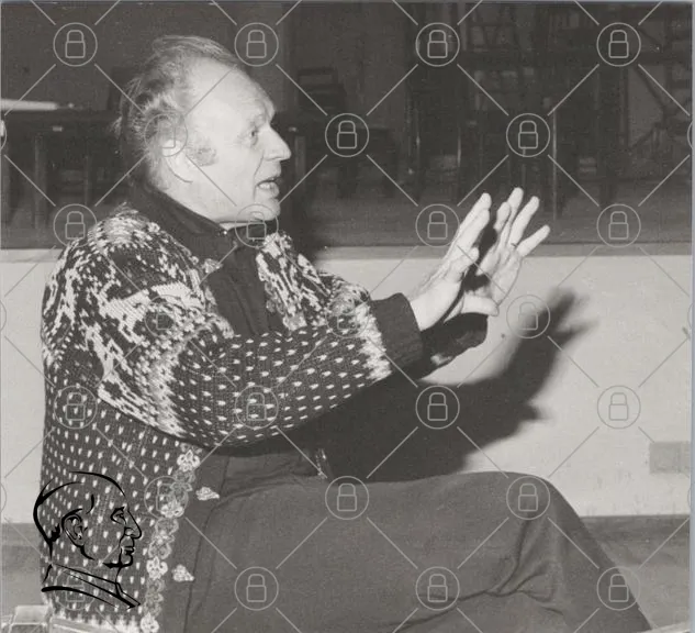 man, svartvitt, gestikulera, kläder, tröja, mönster, scen, föreläsning, uttryck, händer, sittande, bakgrund, stolar, kultur, 1900-tal, fotografi, konst, tal, diskussion, kreativitet, uttrycksfull
