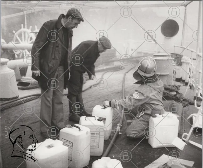 män, arbete, industri, säkerhet, brandman, behållare, rör, gammal, svartvit, fabrik, utrustning, teamwork, miljö, maskiner, verktyg, kläder, hjälm, mänsklig aktivitet, historisk, arbetsplats, samarbete, insats, brand, risk, professionell, traditionell, teknik, inspektion, noggrannhet, fokus