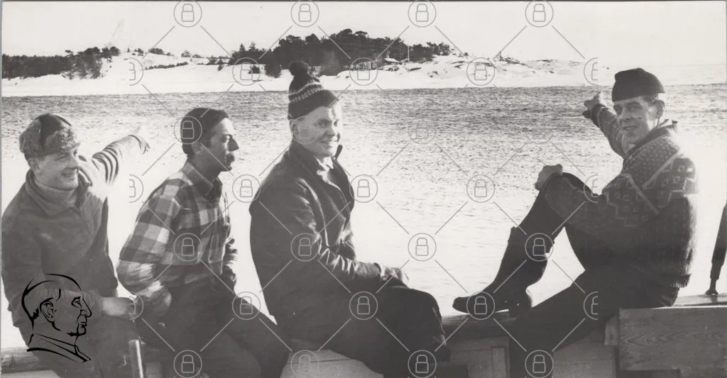 män, sittande, strand, vatten, träd, snö, vinter, samtal, natur, landskap, svartvitt, kläder, hatt, leende, båt, avkoppling, vänner, gammal, fotografi, tradition, utomhus, stillhet, gemenskap, minnen, historia, kultur, fritid, njuta, lugn, perspektiv