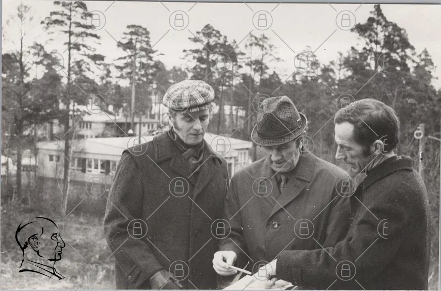 historisk, svartvit, män, diskussion, skog, kläder, hattar, papper, byggnader, natur, 1900-tal, fotografi, landskap, samarbete, dokument, tradition, utomhus, ansikten, äldre, grupp