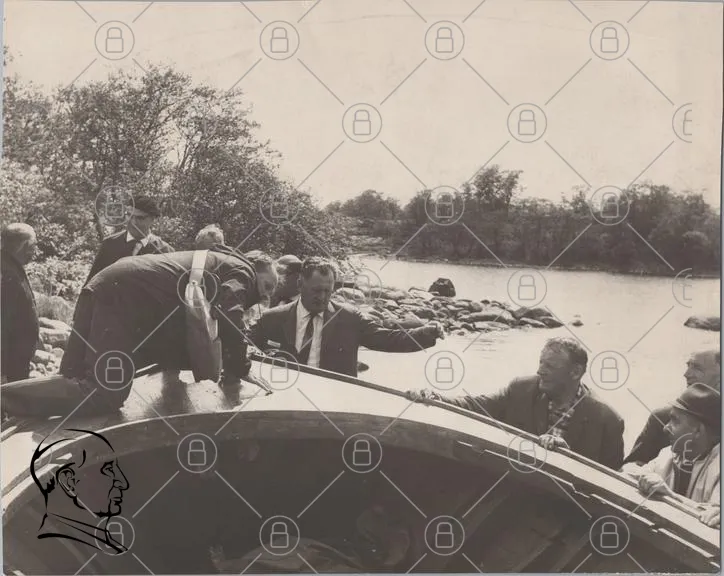 båt, män, vatten, träd, kläder, 1950-tal, samling, sten, flod, natur, historisk, svartvit, aktivitet, utomhus, möte, landskap, fotografering, tradition, kultur, grupp, rolig, ansikten, interaktion, båtutflykt, rekreation, vänner, socialt, nöje, miljö, skärgård