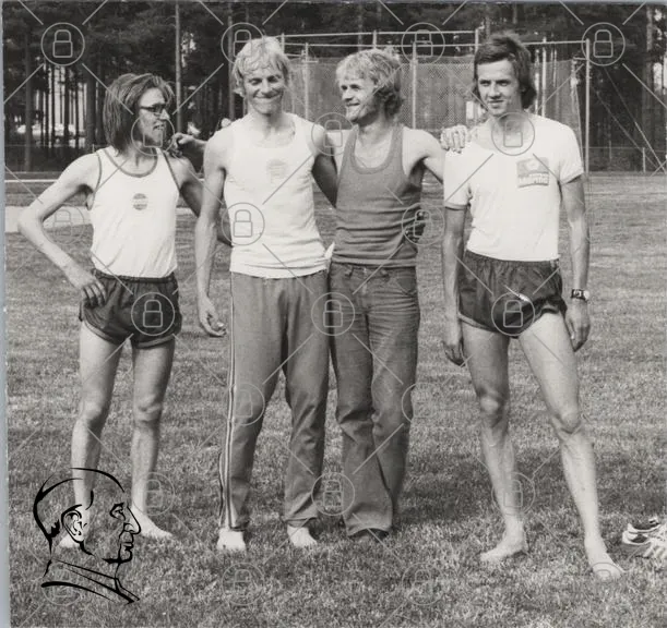 män, sport, träning, shorts, t-shirt, gräs, utomhus, 1970-tal, grupp, leende, motion, atletisk, kompisar, svartvitt, avslappnad, idrott, samarbete, vänskap, tävling, jogging, fotboll, fritid, aktivitet, stil, retro, ungdomar, glädje, gemenskap, natur