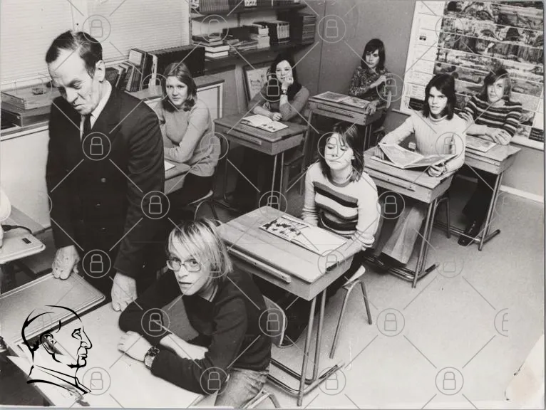 klassrum, lärare, elever, skrivbord, skola, svartvitt, 1970-tal, undervisning, böcker, studenter, kläder, koncentration, lärande, interaktion, ungdomar, pedagogik, skolmiljö, fotografi, retro, traditionell, utbildning, ansikten, samarbete, klasskamrater, lärande, diskussion, uppmärksamhet, skolsituation, klassrumsmiljö, lärarstudent