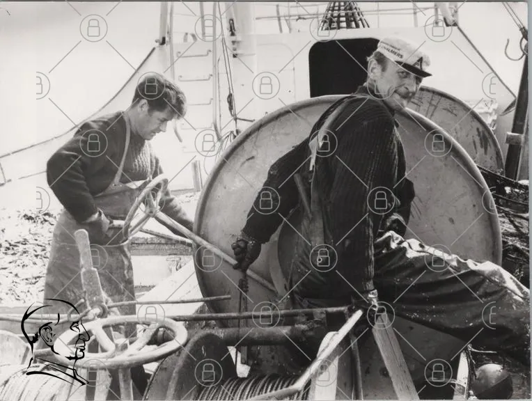 fiskare, båt, arbete, snö, hav, utrustning, rull, rep, man, svartvitt, fiske, sjöfart, industri, tradition, teamwork, fiskeutrustning, hamn, marin, arbetskläder, fiskeindustri
