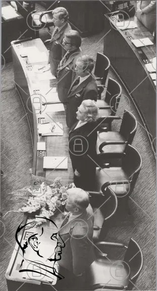 politiker, debatt, tal, parlament, möte, historia, svartvit, stående, blommor, bord, stolar, kläder, 1900-tal, officiellt, samling, röstning, beslut, ledarskap, representation, offentlighet
