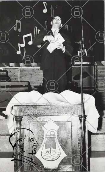 man, scen, musik, mikrofon, papper, kläder, svart, vit, instrument, publik, föreställning, 1950-tal, retro, underhållning, evenemang, talare, stående, bänk, ljudutrustning, noter, traditionell, klänning, kostym, presentation, artist, kultur, historia, fotografi, svartvitt, gammal, fest