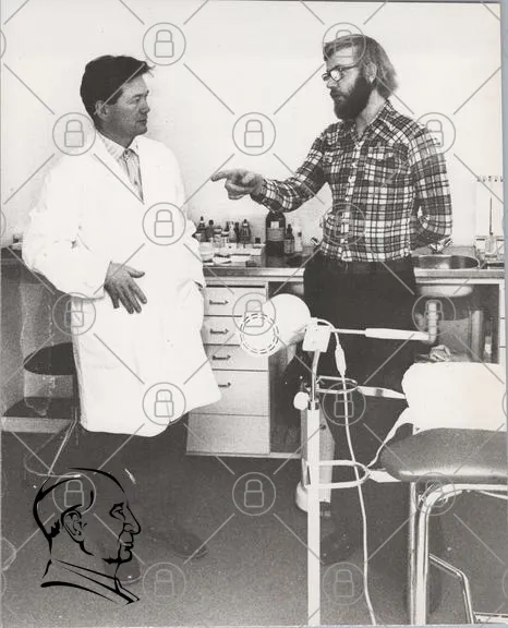 tandläkare, medicinsk, kontor, diskussion, laboratorie, utrustning, vit rock, glasögon, skägg, 1970-tal, svartvitt, tandvård, professionell, patienter, verktyg, forskning, medicin, hälsa, teknik, miljö