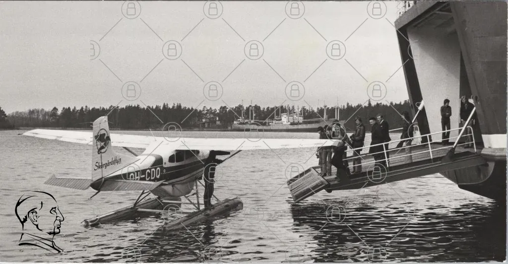 flygplan, OH-CDQ, sjö, människor, båt, landning, vatten, skärgård, transport, 1960-tal, svartvitt, flygning, passagerare, kaj, hamn, natur, träbrygga, flygplats, äventyr, resor, historia, teknik, fritid, sommar, landskap, fotografering, nostalgi, säkerhet, samarbete, aktivitet