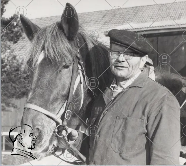 häst, man, gammal, svartvitt, bondgård, landsbygd, kläder, glasögon, hatt, sele, djur, natur, tradition, jordbruk, fotografi, historia, landskap, vänskap, arbete, rural, nostalgi, hästskötare, ansikte, porträtt, gammaldags, utomhus, sommar, lugn, stillhet, manlig, hästhuvud