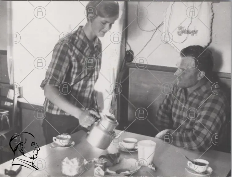 kaffe, te, kopp, bord, man, pojke, rutigt, kläder, servera, samtal, bakgrund, kök, mat, tårta, mjölk, gammal, svartvit, inomhus, fika, tradition, familj, gemenskap, 1970-tal, retro, hemtrevligt, fika, sällskap