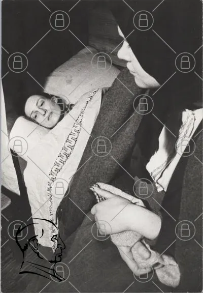 sjukhus, kvinna, säng, sjuk, omsorg, medicinsk, vård, historia, svartvitt, känslor, närhet, familj, sorg, 1900-tal, interiör, kläder, ansikte, lugn, trygghet, hand, filt, sängkläder, rum, vårdpersonal, kvinnofigur, hälsa, liv, död, relationer, tradition