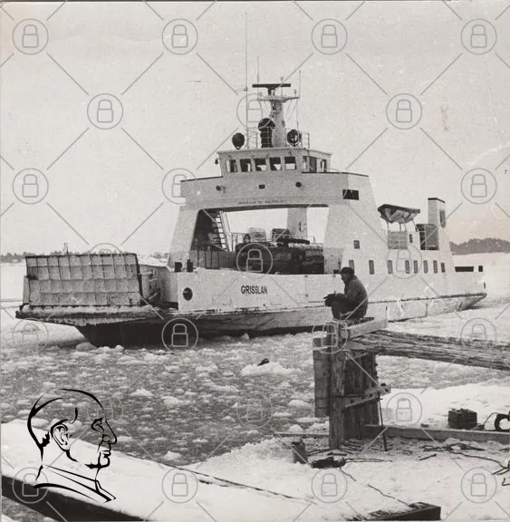 färja, is, vinter, sjö, Grislan, transport, båt, hamn, vatten, snö, landskap, byggnad, man, brygga, frakt, passagerare, sjöfart, natur, foto, svartvit