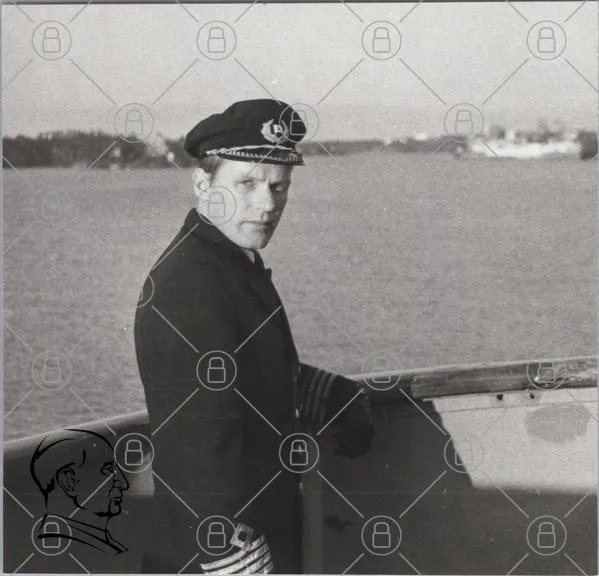 kapten, båt, sjö, uniform, svartvitt, hav, fartyg, man, båtens däck, navigering, marin, historia, fotografi, 1900-tal, sjöfart, skärgård, kaptenhatt, stilla vatten, landskap, sjöman