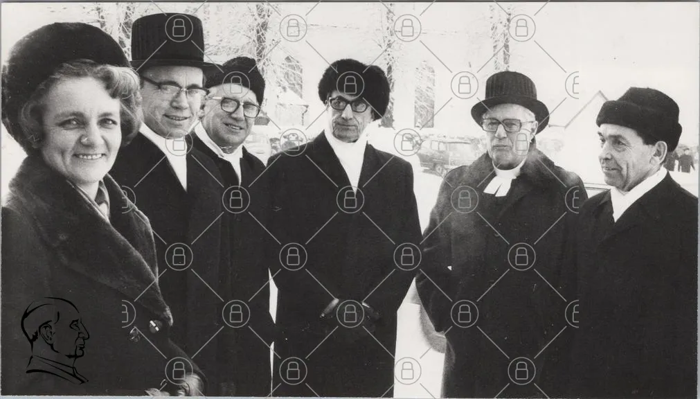 historisk, svartvit, grupp, män, hattar, kostymer, glasögon, formella kläder, vinter, snö, utomhus, porträtt, traditionell, stil, 1900-tal, samling, dignitärer, möte, kultur, representation