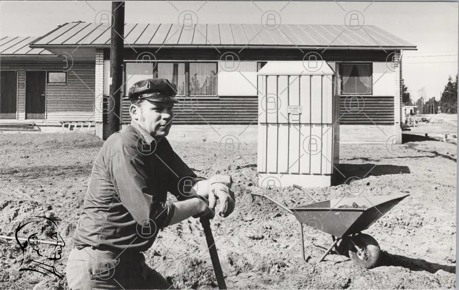 man, hatt, byggarbetsplats, skottkärra, byggnad, svartvitt, arbete, verktyg, jord, fönster, tröja, handskar, mark, konstruktion, 1900-tal, utomhus, landskap, industri, arbetskläder, historisk, fotografi