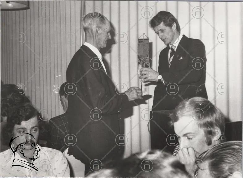 svartvitt, bild, män, trofé, fest, kläder, 1980-tal, evenemang, leende, äldre, yngre, samarbete, firande, publik, inomhus, bord, klippning, minnen, tradition, socialt, interaktion, pris, utmärkelse, stil, klippning, bakgrund, dekoration, samtal, nostalgi