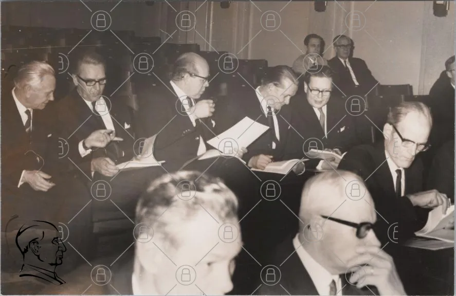 möte, män, kostymer, papper, anteckningar, glasögon, sittande, diskussion, 1960-tal, svartvitt, konferens, allvarliga, inomhus, grupp, ledarskap, affärsmän, formalitet, presentation, fokus, samarbete