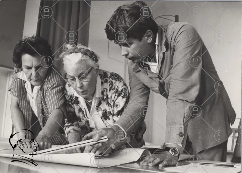 personer, diskussion, arbete, papper, ritningar, svartvitt, kläder, inomhus, samarbete, äldre, yngre, fokus, kreativitet, design, utbildning, grupp, interaktion, tradition, konst, hantverk, lärande, erfarenhet, generationer, projekt, planering, detaljer, verktyg, material, analys, presentation