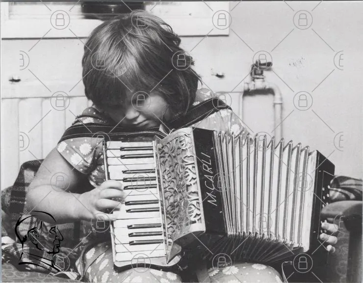 barn, dragspel, musik, svartvitt, spelande, inomhus, leende, kläder, 1970-tal, nostalgi, instrument, ungdom, kreativitet, kultur, hobby, underhållning, tradition, konst, uttryck, glädje, fokus