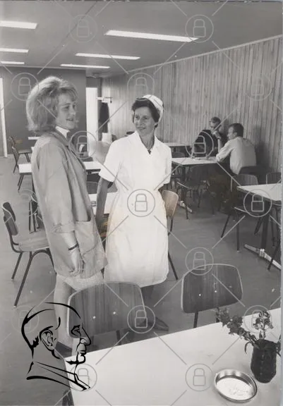 sjukhus, personal, kvinna, sjuksköterska, 1960-tal, svartvitt, inomhus, möbler, bord, stolar, samtal, vård, kläder, frisyr, miljö, interiör, leende, arbete, hälsa, patienter, avdelning