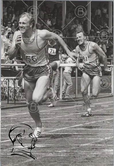 löpare, tävling, sport, svartvitt, nummer 56, nummer 61, nummer 71, stadion, publik, hastighet, atlet, motion, idrott, 1960-tal, löpning, träning, konkurrens, manliga idrottare, banor, prestation, energi, fokus, svett, muskulös, snabbhet, adrenalinkick, uthållighet, lopp