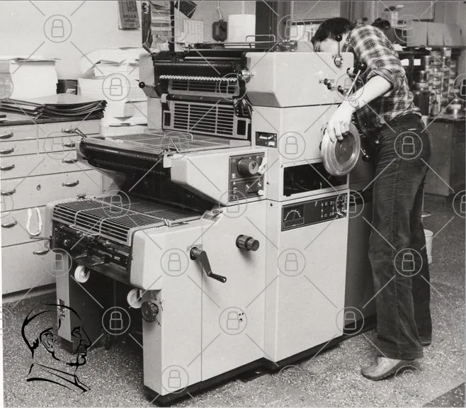 tryckmaskin, svartvit, industri, papper, tryckeri, arbete, teknik, mekanik, man, verkstad, utrustning, produktion, hantverk, retro, professionell, kontor, arbetsplats, rullpapper, maskindelar, arbetskläder, 1970-tal, vintage, manuell, process, tryckmetod, design, kvalitet, precision, hantverkskonst