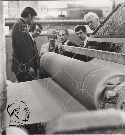 industri, fabrik, människor, maskiner, textil, produktion, 1970-tal, svartvitt, arbete, teknik, besök, grupp, män, kvinna, papper, process, fabriksmiljö, övervakning, samarbete, traditionell, historia, arbetsplats, ingenjörer, ledning, presentation, material, innovation, design, kvalitet, maskinteknik