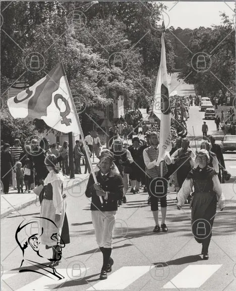 parad, flaggor, kvinnor, män, traditionella kläder, fest, samhälle, marsch, historisk, svartvit, demonstration, gemenskap, kultur, folkdräkt, festligheter, 1900-tal, tåg, glädje, samling, medborgarrätt, aktivism, folklig, identitet, historia, social rättvisa, symboler, engagemang, solidaritet, evenemang