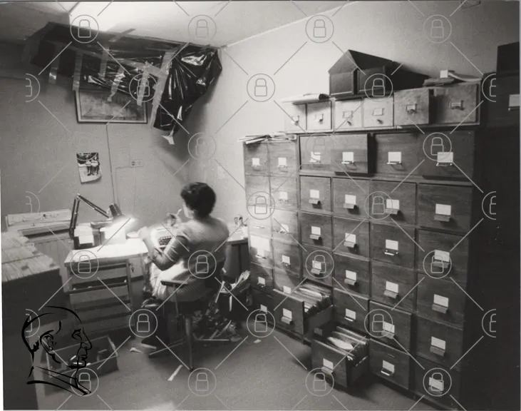 kontor, skrivbord, arkivskåp, papper, belysning, person, arbete, svartvitt, inomhus, organisation, kontorsmaterial, stolar, väggar, lådor, dokument, skrivmaskin, lampor, kontorsutrustning, kreativitet, fokus, arbetsmiljö, retro, stillhet, koncentration, arbetsplats, förvaring, kontorslandskap, arbetsuppgifter, planering, struktur