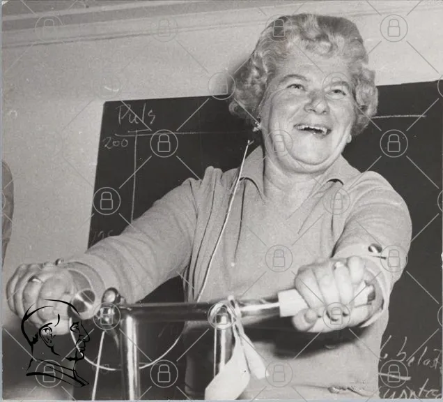 cykel, träning, kvinna, skratt, svartvitt, gym, hälsa, motion, pulsmätare, 1900-tal, leende, sport, fitness, pedagogik, aktivitet, inomhus, cykelmaskin, äldre, energisk, entusiastisk, klassrum, undervisning, välmående, glädje, kropp, styrka, balans, välbefinnande, livsstil, rolig