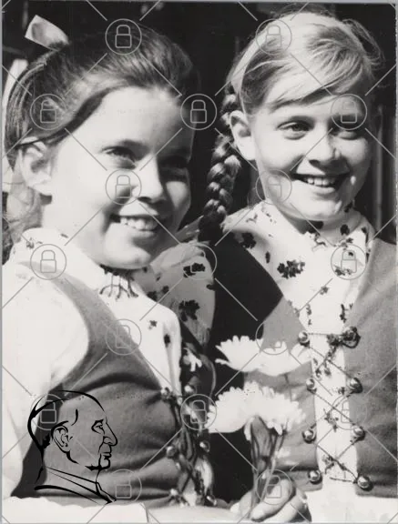 flickor, leende, traditionella kläder, blommor, svartvitt, porträtt, barn, vänskap, kultur, fotografering, 1960-tal, svenska, glädje, natur, sommar, fest, folkloristisk, klänningar, hårflätor, ungdom, nostalgi