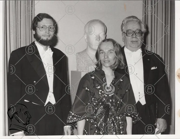 svartvitt, foto, människor, kostymer, klänning, skulptur, staty, 1970-tal, evenemang, porträtt, man, kvinna, glasögon, frisyr, bakgrund, konst, kultur, gala, fest, tradition, stil, uttryck, samarbete, grupp, historia, minne, utställning, konstverk, fotografi, tid