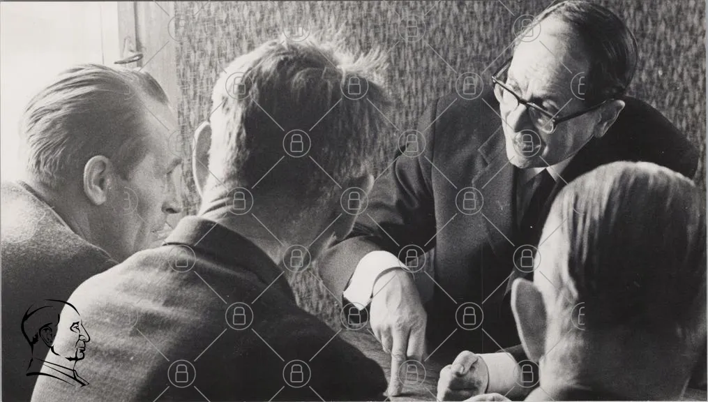möte, diskussion, män, kostym, glasögon, 1960-tal, svartvitt, ansikten, samtal, interaktion, kontor, professionell, uttryck, kroppsspråk, fokus, grupp, idéer, samarbete, forskning, utbildning