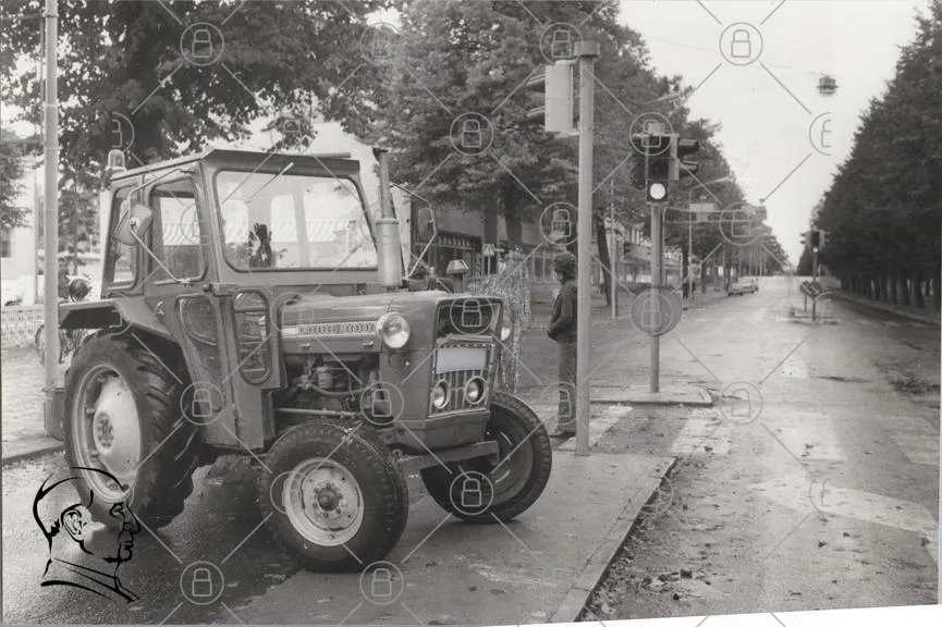 traktor, trafikljus, gata, träd, asfalt, människor, gammal, svartvit, landskap, fordon, parkering, väg, stadsbild, maskin, jordbruk, landsbygds, transport, motor, hjul, byggnader, cykel, skyltar, fotgängare, retro, industriell, miljö, landskap, urban, historia, teknik
