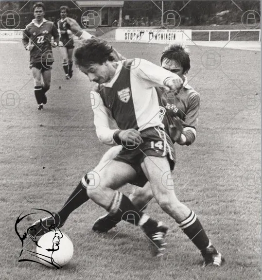 fotboll, spelare, match, sport, svartvitt, tackling, nummer 14, nummer 22, gräs, boll, lag, konkurrens, idrott, manlig, utomhus, 1980-tal, fotbollsskor, tröja, motståndare, publik, arena