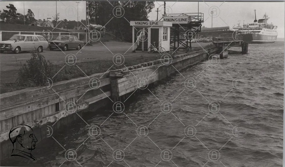 Viking Line, hamn, båt, kaj, vatten, trä, byggnad, bil, cykel, parkering, svartvitt, landskap, brygga, trafik, resor, transport, sjöfart, terminal, skylt, natur